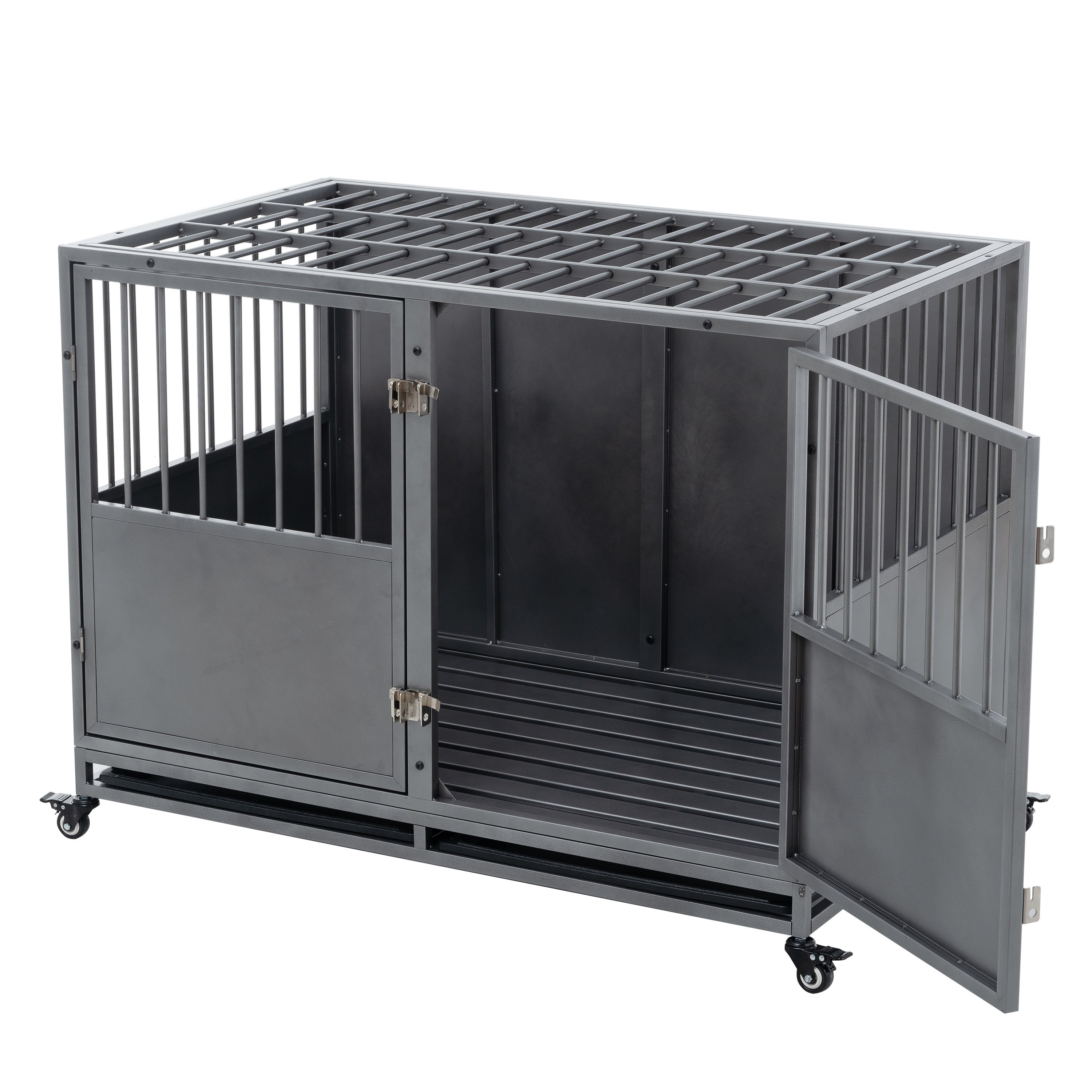 Feasures:Sturdy: Our dog crates features 10 mm diameter metal pipes that effectively prevent chewing, ensuring durability and avoiding deformation. The heavy-duty frame construction combines square tubing and metal sheet, providing your pet with a long-lasting, stable, and safe resting place. Ventilation & Privacy: The spacious interior provides maximum comfort for your beloved companion. The open metal bars allow for visibility and optimal wind flow, preventing overheating. The metal sheet helps your dog experience inner peace of mind, avoiding any feeling of confinement while enjoying a well-ventilated environment.Backside Screened: keep you pet away from the wall when you place the crate close to the wallpaper or wallboard.Double Door Style: There are two doors in front side, you can open one or both for your needs, and also you can divide the crate space when the dog is just a puppy.